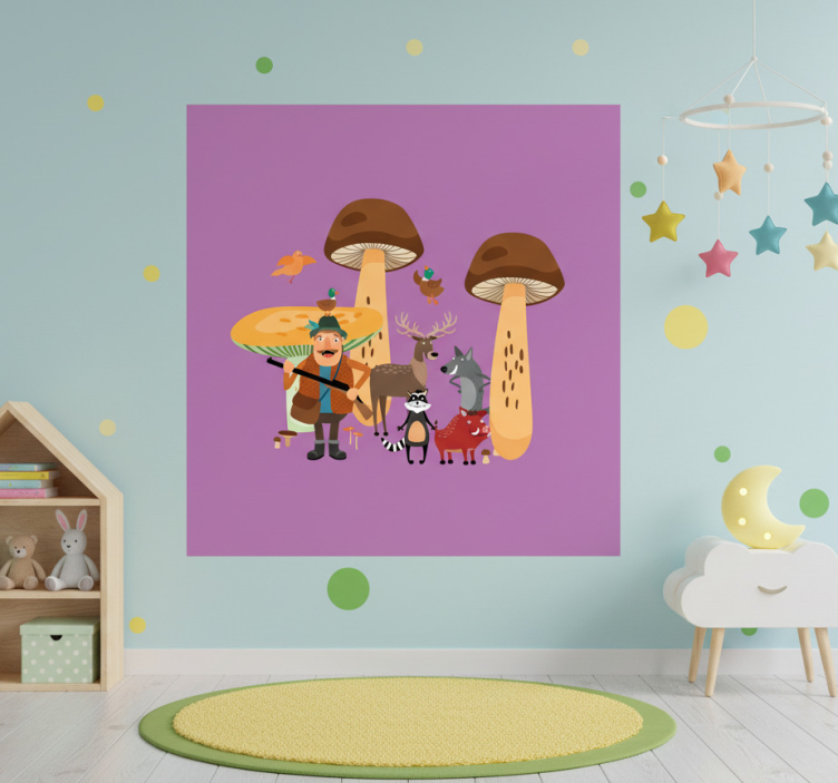 Poster chambre enfant oiseaux dans la forêt de champignons