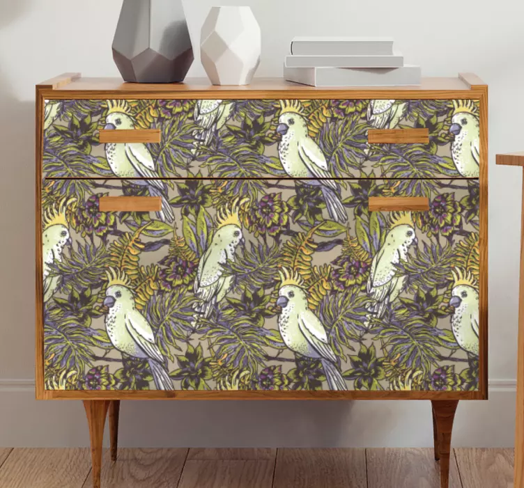 Découvrez un design captivant avec notre Adhésif meuble concept inspiré des oiseaux vivants qui embellit votre intérieur avec des motifs de perroquet, de feuilles et de fleurs. Ce modèle coloré et tropical évoque la nature et la flore, transformant vos meubles en véritables œuvres d'art.