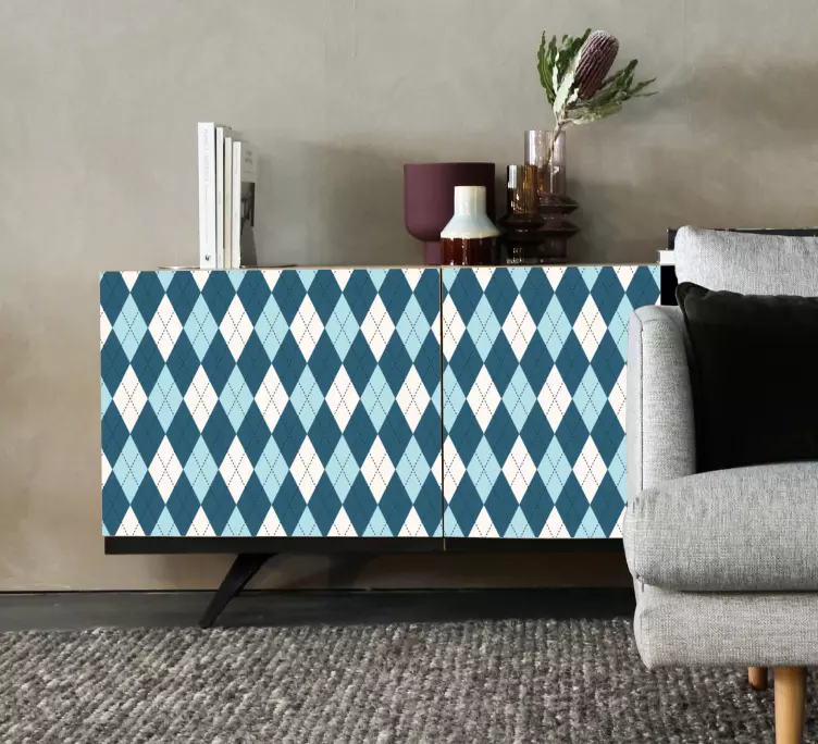 Transformez votre espace avec notre Adhésif meuble configuration en forme de diamant ! Ce magnifique modèle arbore un motif de rhombe, de losanges et de diamants dans un style géométrique et décoratif en bleu. Chaque pièce devient une œuvre d'art moderne qui attire le regard et sublime vos meubles.