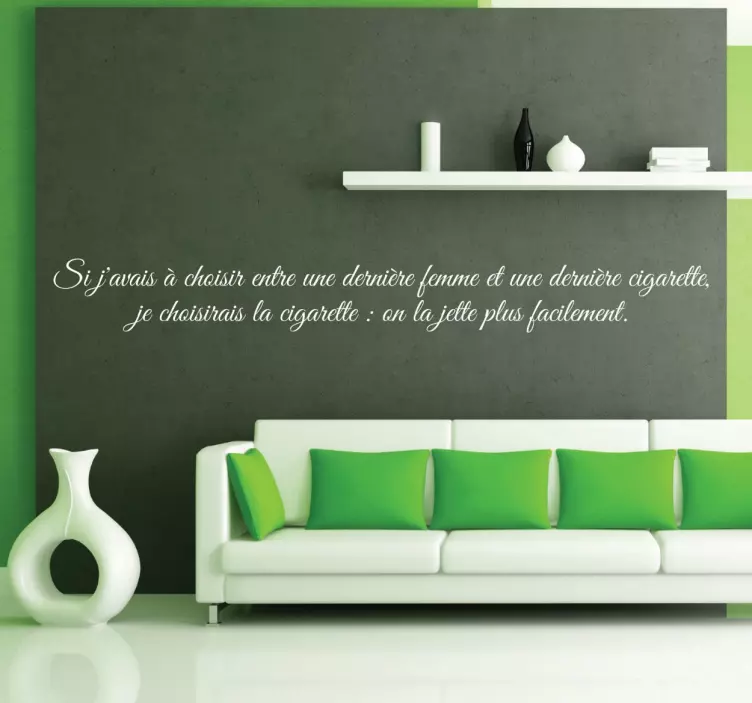 Référence: A7981Envie de refaire votre déco mais vous ne trouvez pas l'inspiration ? Voici une idée originale avec ce sticker citation cigarette qui surprendra sans aucun doute vos amis et invités. Autocollant facile à appliquer et de grande qualité pour toute la maison.