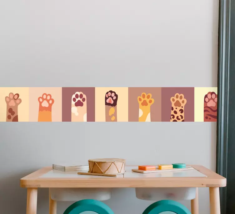Découvrez le Sticker empreintes de pattes joyeuses, un design captivant qui allie une touche de dessin animé à un motif de pattes colorées. Avec son ambiance ludique, ce sticker évoque la joie des animaux domestiques et embellit vos murs à l'aide d'un carrelage de motifs en tuile qui apporte une frontière charmante entre chaque animal représenté. Transformez votre espace avec ce modèle unique !