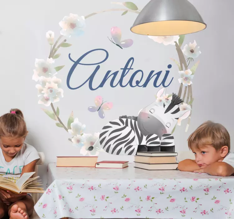 Découvrez notre Sticker enfant design floral zèbre, un véritable chef-d'œuvre qui apportera une touche de magie à la chambre de vos petits. Avec son motif personnalisable, intégrant un zèbre espiègle entouré de fleurs, ce sticker est à la fois mignon et capricieux. La calligraphie délicate et la couronne florale ajoutent une note de douceur qui séduira les enfants et les parents !