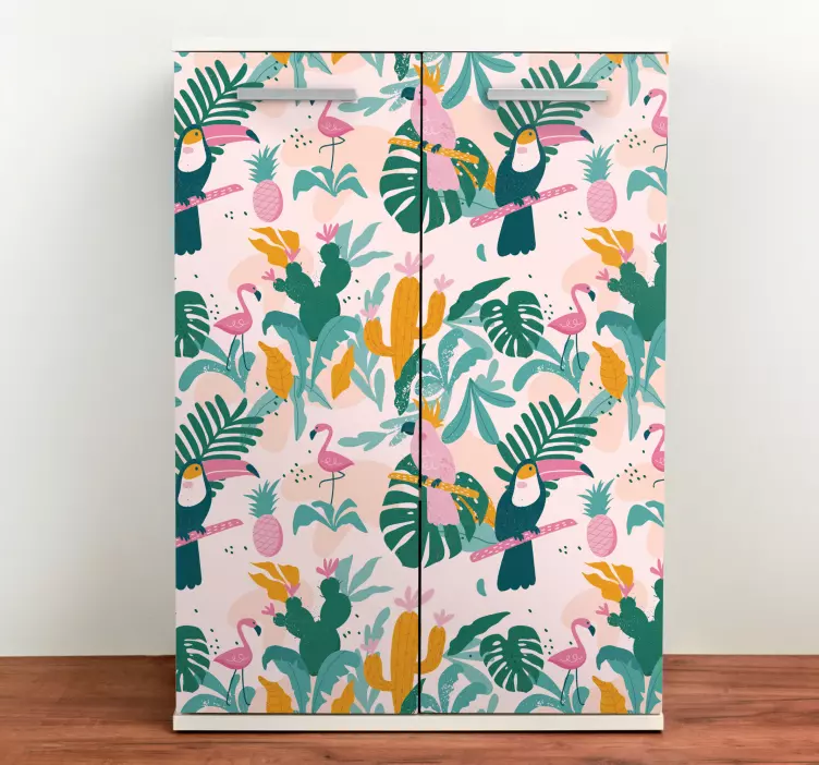 Plongez dans un univers vibrant et coloré avec notre Adhésif meuble paradis des oiseaux tropicaux. Ce motif enchanteur, orné de magnifiques oiseaux, de flamants roses, de cactus et de feuilles luxuriantes, apporte une touche de nature à votre intérieur. Vous serez séduit par l'énergie tropicale qu'il diffuse, transformant vos meubles en véritables œuvres d'art vivantes.