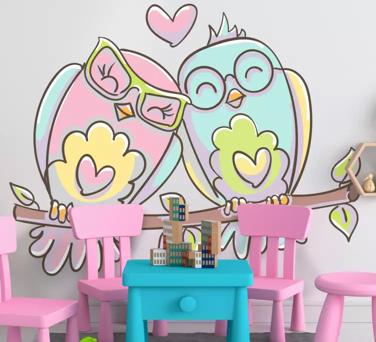 Découvrez notre Sticker oiseaux oiseaux d'amour adorables, une illustration pleine de charme représentant des hiboux et des chouettes, où l'amour se manifeste à travers des couples d'oiseaux mignons. Avec des couleurs tendres de rose et de bleu, ces oiseaux apportent une touche joyeuse et réconfortante à votre intérieur, créant une atmosphère chaleureuse et accueillante.