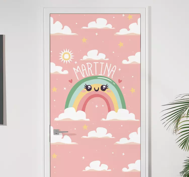 Apportez une touche unique à votre intérieur avec notre Sticker porte design arc-en-ciel personnalisé. Ce design enchanteur met en scène des nuages doux, un magnifique arc-en-ciel, un soleil radieux et un aspect mignon et drôle qui égayera n'importe quelle porte. Personnalisez-le avec votre nom pour un effet encore plus amusant ! En un clin d'œil, transformez une porte ordinaire en un espace vibrant de joie et de créativité.