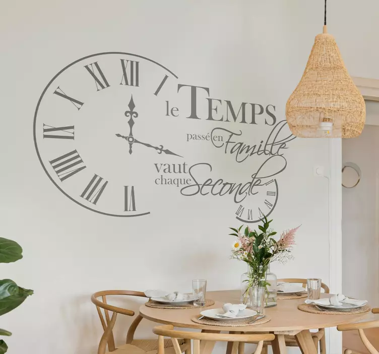 Le sticker pour salle à manger citation inspirante avec horloge est l'ajout idéal à votre décoration pour créer une ambiance chaleureuse et inspirante. Sa citation encourageante apporte une touche de positivité à votre espace de vie, tandis que l'horloge rappelle l'importance du temps et de la famille.