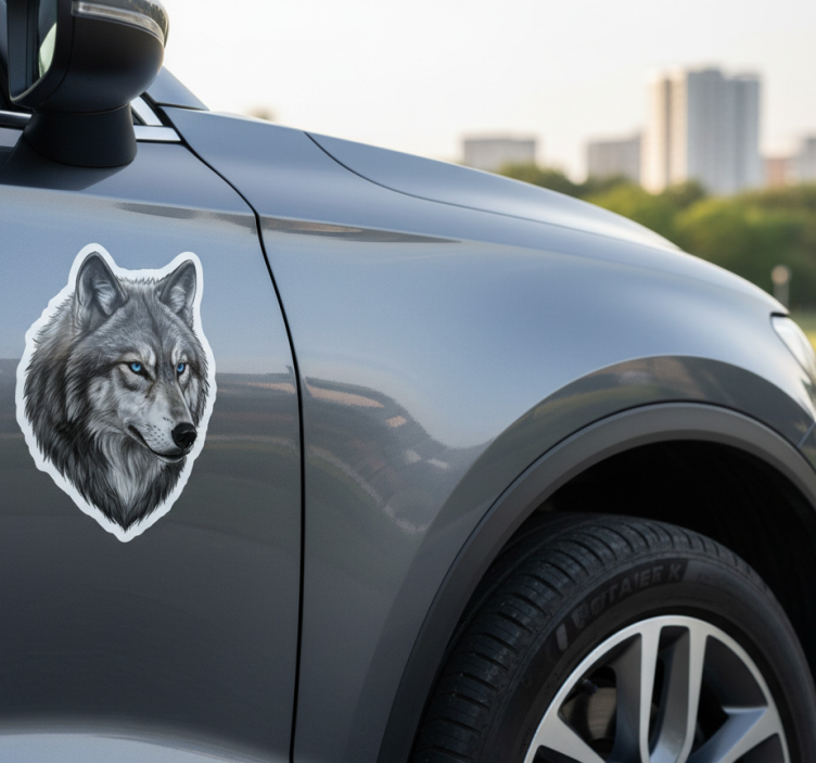 Sticker voiture loup aux yeux bleus sauvage