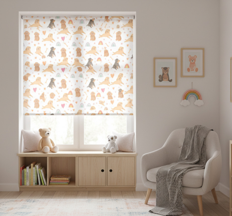 Toile fenêtre chambre enfant motif chien et arc-en-ciel
