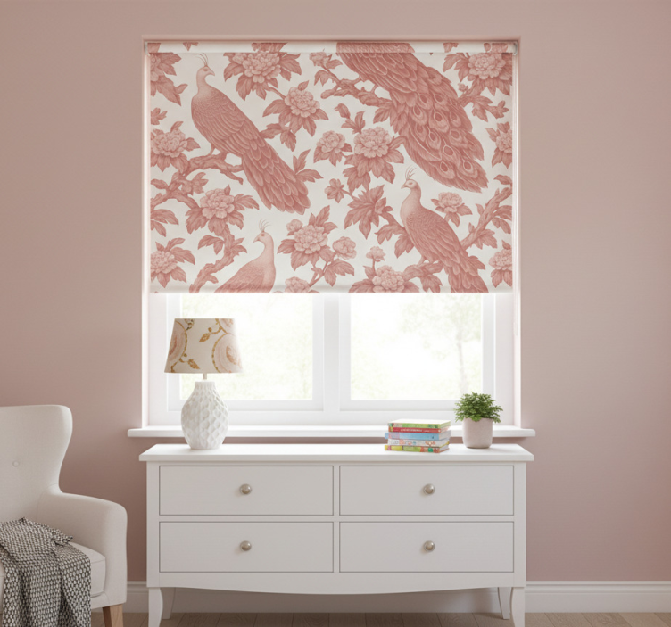 Toile fenêtre rose motif paons roses