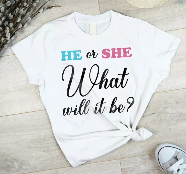 Référence: T4722Ce vêtement accrocheur présente une question amusante sur la révélation du genre, demandant 'What will it be?' avec un texte vibrant. L'utilisation ludique des couleurs ajoute de l'excitation, le rendant parfait pour les célébrations en famille et les moments mémorables.