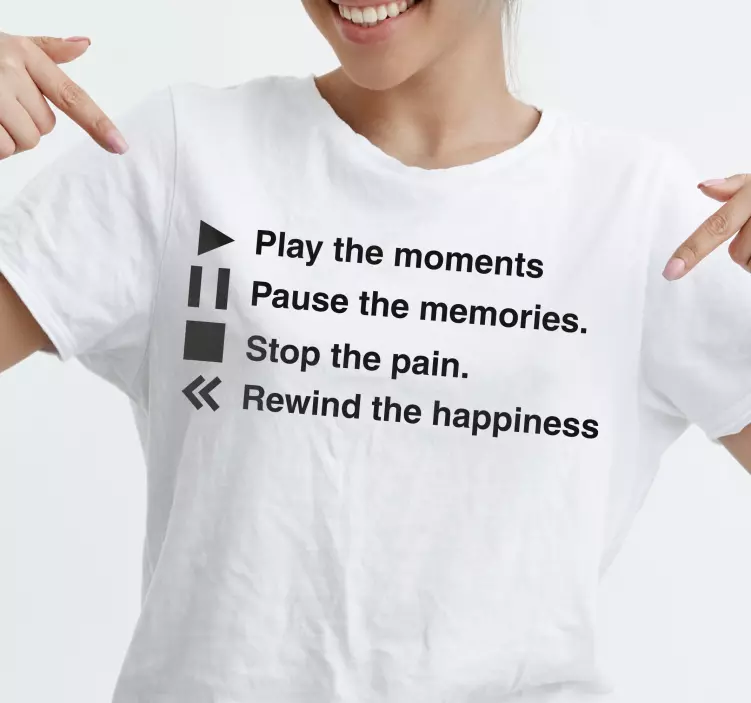 Découvrez notre T-shirt moments de bonheur, un vêtement qui allie style et positivité ! Avec son design inspirant, ce t-shirt arbore des éléments tels que jouer, pause, arrêter, et des slogans motivationnels en anglais. Son esthétique en noir et blanc évoque des émotions de mémoire et de joie, vous rappelant chaque instant précieux. Portez-le pour exprimer votre philosophie de vie et partager des moments de bonheur autour de vous !