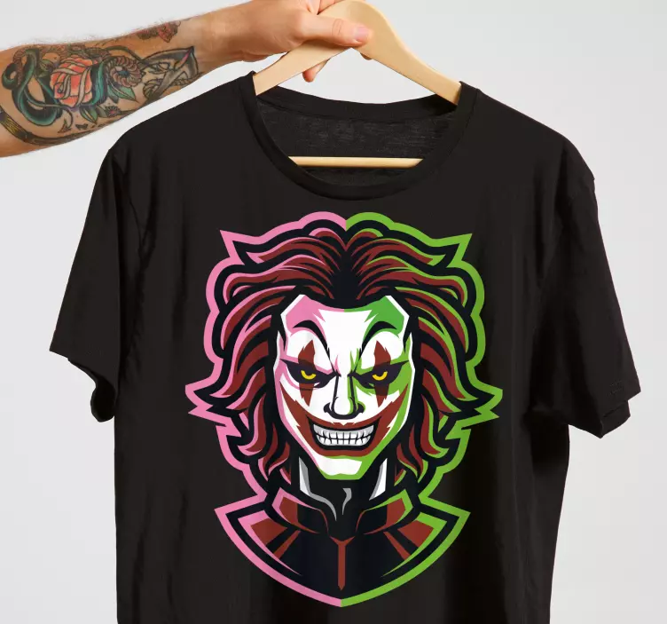 Découvrez notre T-shirt personnage de clown effrayant, une pièce unique qui saura captiver tous les amateurs de frissons et d'histoires d'horreur ! Avec son design graphique évoquant un visage de scélérat tout droit sorti d'une bande dessinée ou d'un film d'horreur, ce t-shirt est une illustration parfaite pour Halloween. Les couleurs vives et l'expression du visage de ce pitre ajoutent une touche de fantaisie à votre garde-robe.