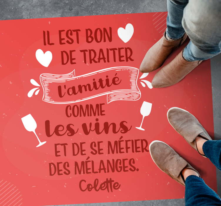 Sur le fond rouge de ce tapis en vinylee original, vous pouvez lire un texte très important qui parle de vos amis, qui disent qu'ils sont similaires aux vins, car il faut se méfier des mélanges possibles. Avec cette citation inspirante, votre tapis devient plus qu'un simple accessoire de décoration, il devient une pièce de conversation.